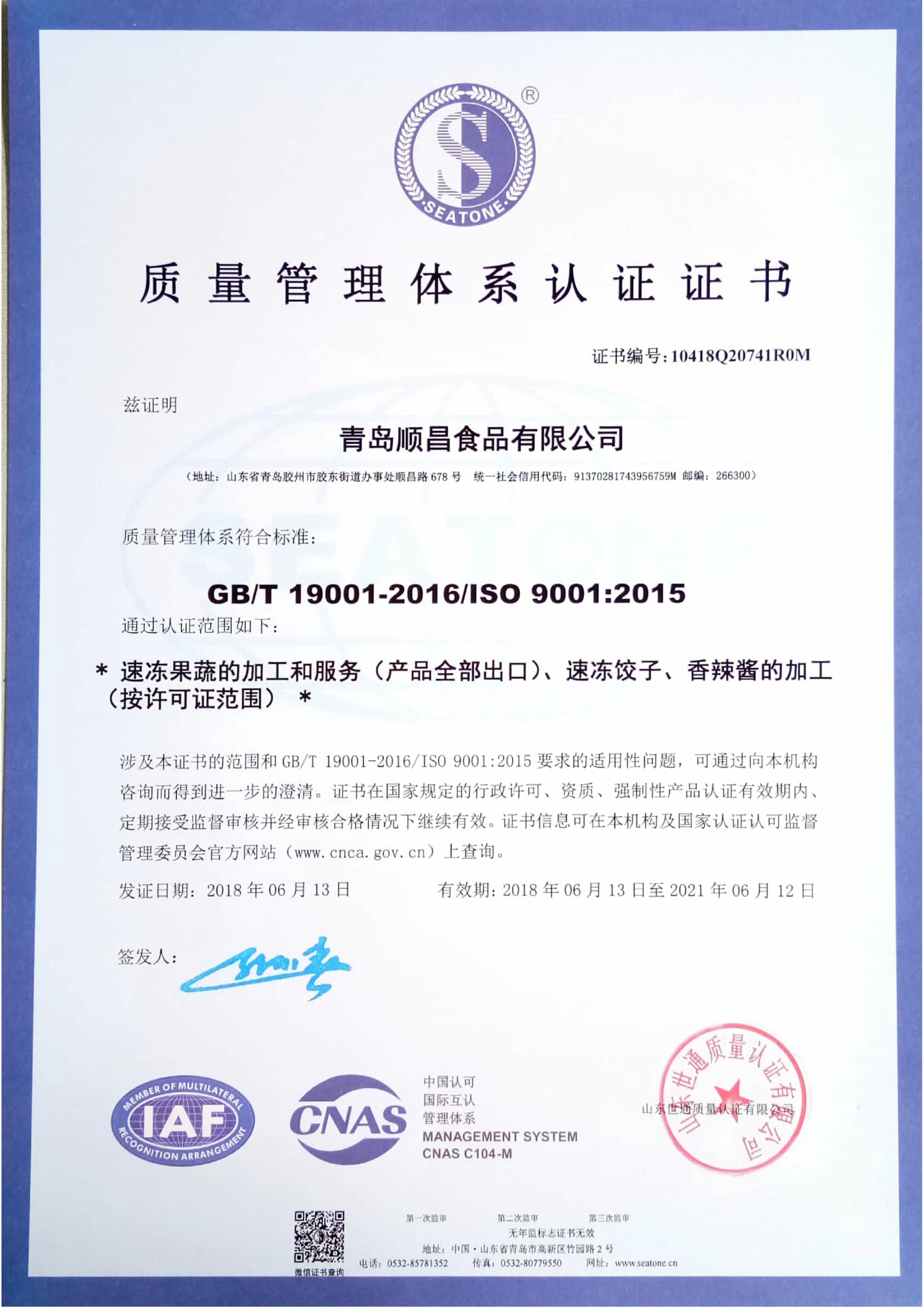 質(zhì)量管理體系證書
