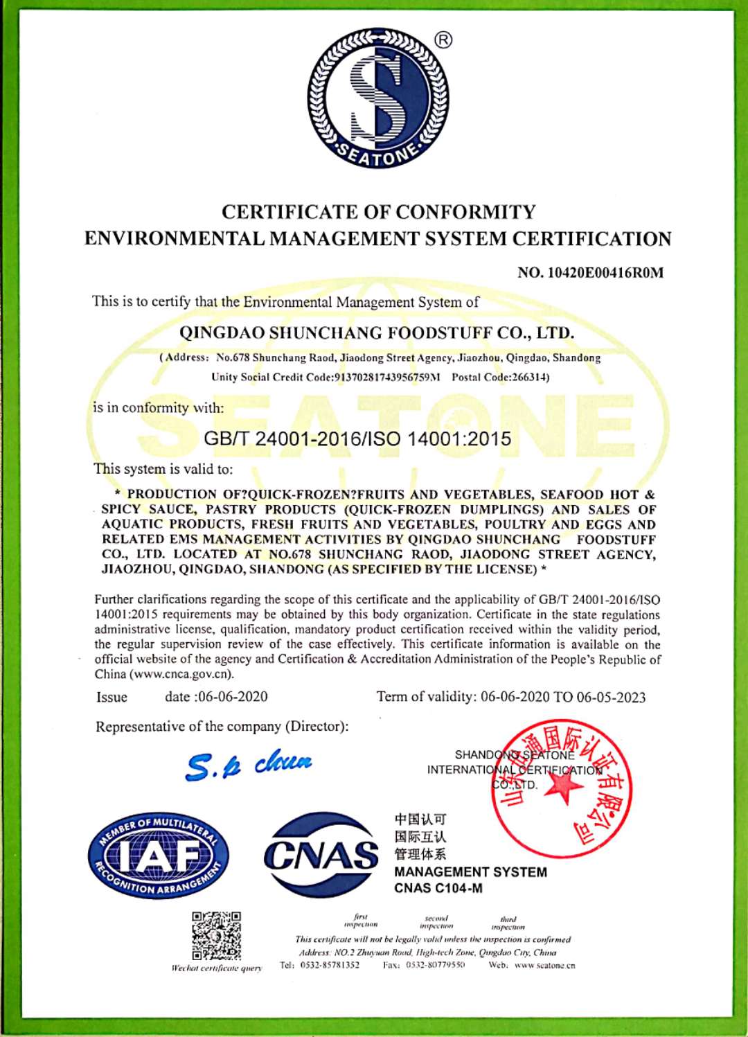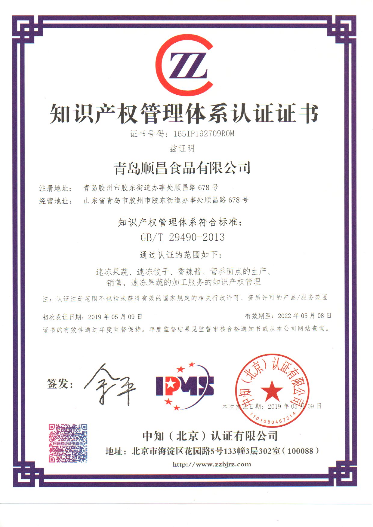 Certificate of quality management system